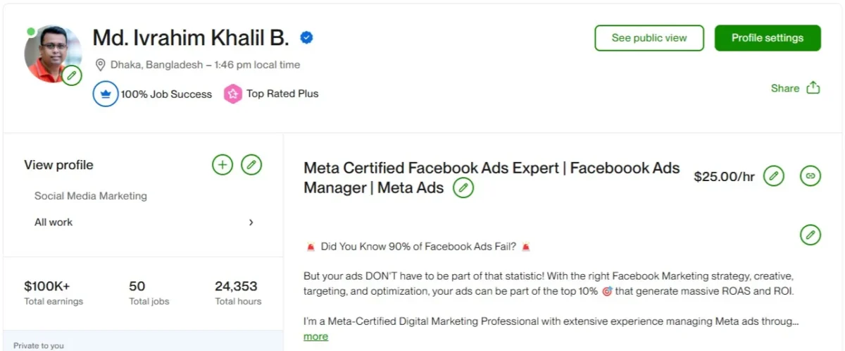 আমার দীর্ঘ সময়ের অভিজ্ঞতা আমাকে শুধু একজন সফল ফ্রিল্যান্সারই করেনি, বরং Upwork এর টপ রেটেড ফ্রিল্যান্সার হিসেবে স্বীকৃতি এনে দিয়েছে। এই প্ল্যাটফর্মে আমি ১০০% জব সাকসেস রেট ধরে রেখে 130k ডলারের বেশি আয় করতে পেরেছি। কিন্তু এই সাফল্য কেবল আমার গল্প নয়। সঠিক জ্ঞান, কৌশল এবং পরিশ্রম দিয়ে যে কেউ ফ্রিল্যান্সিং দুনিয়ায় একটি আলাদা জায়গা তৈরি করতে পারে।