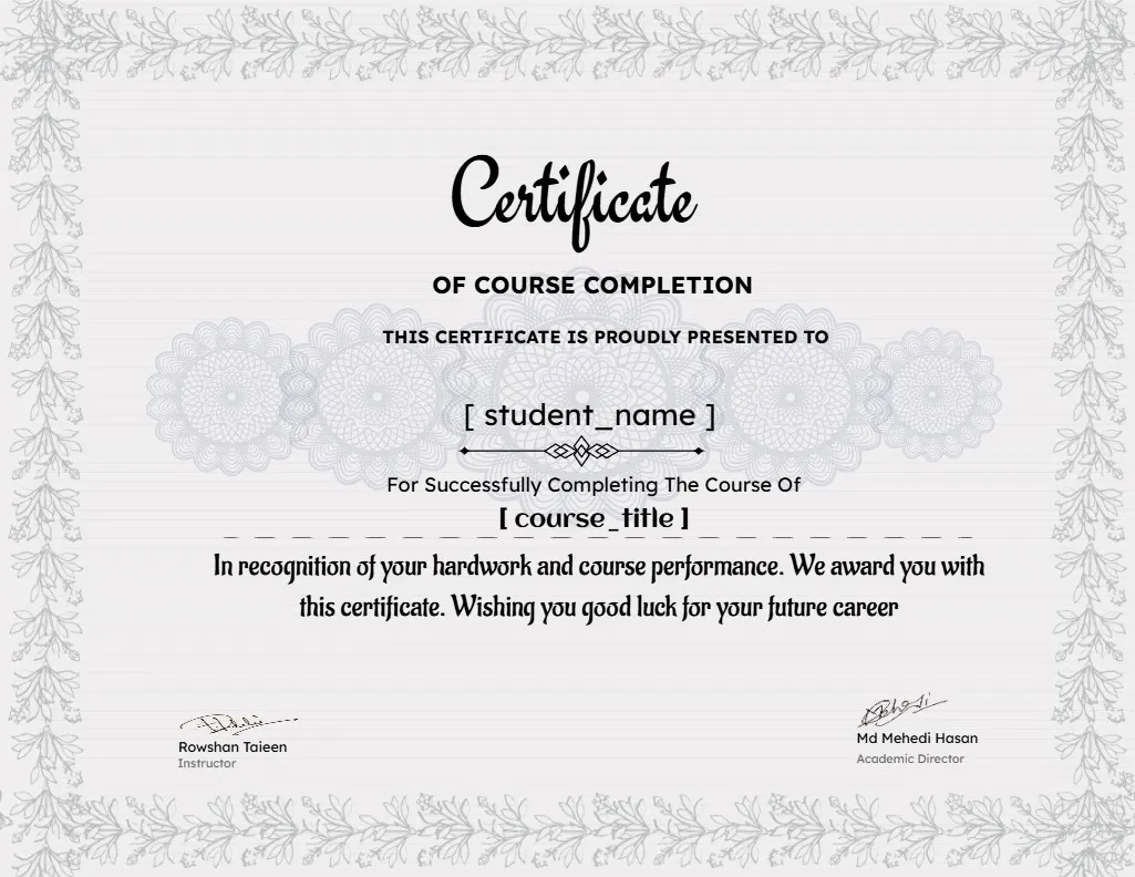 কোর্স সফলভাবে শেষ করার পর আপনি একটি সুন্দর সার্টিফিকেট পাবেন। এই সার্টিফিকেট আপনার শেখার স্বীকৃতি হিসেবে কাজ করবে এবং আপনার দক্ষতা ও যোগ্যতাকে আরও আকর্ষণীয়ভাবে উপস্থাপন করবে। চাকরির সুযোগ কিংবা ফ্রিল্যান্সিং প্রোফাইলে এটি একটি বিশেষ সংযোজন হবে, যা আপনাকে অন্যদের থেকে আলাদা করে তুলতে সাহায্য করবে।