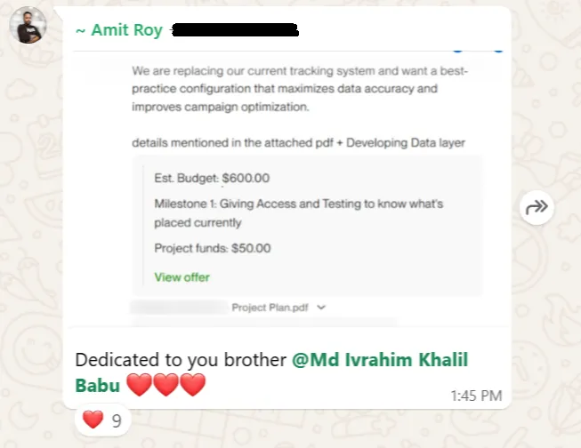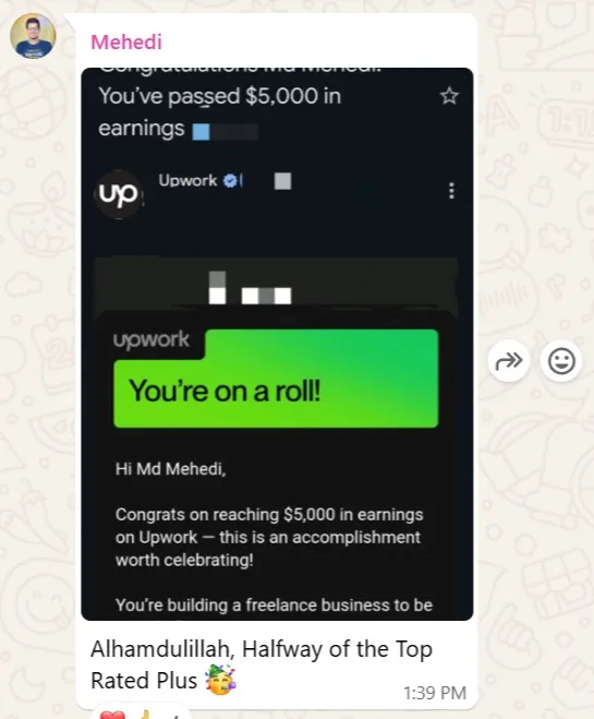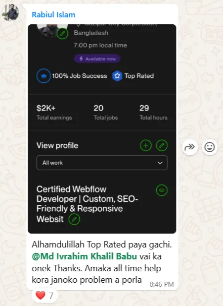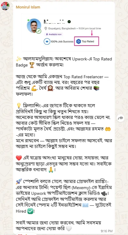 আমার দীর্ঘ সময়ের অভিজ্ঞতা আমাকে শুধু একজন সফল ফ্রিল্যান্সারই করেনি, বরং Upwork এর টপ রেটেড ফ্রিল্যান্সার হিসেবে স্বীকৃতি এনে দিয়েছে। এই প্ল্যাটফর্মে আমি ১০০% জব সাকসেস রেট ধরে রেখে 130k ডলারের বেশি আয় করতে পেরেছি। কিন্তু এই সাফল্য কেবল আমার গল্প নয়। সঠিক জ্ঞান, কৌশল এবং পরিশ্রম দিয়ে যে কেউ ফ্রিল্যান্সিং দুনিয়ায় একটি আলাদা জায়গা তৈরি করতে পারে।